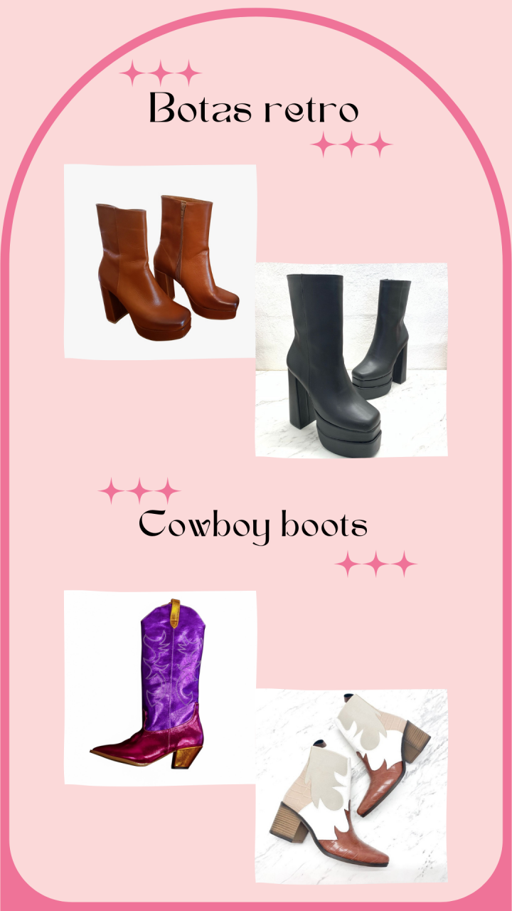 Las botas de colores metálicos son la propuesta favorita de las atrevidas, con las botas retro amarás los modelos de tacón sensato y punta cuadrada y por último las cowboy boots llegaron hace unos años a nuestro armario y desde entonces no nos hemos cansado de combinarlas en todo tipo de looks, desde los más cotidianos, con vaqueros y camiseta, hasta vestidos de inspiración romántica.